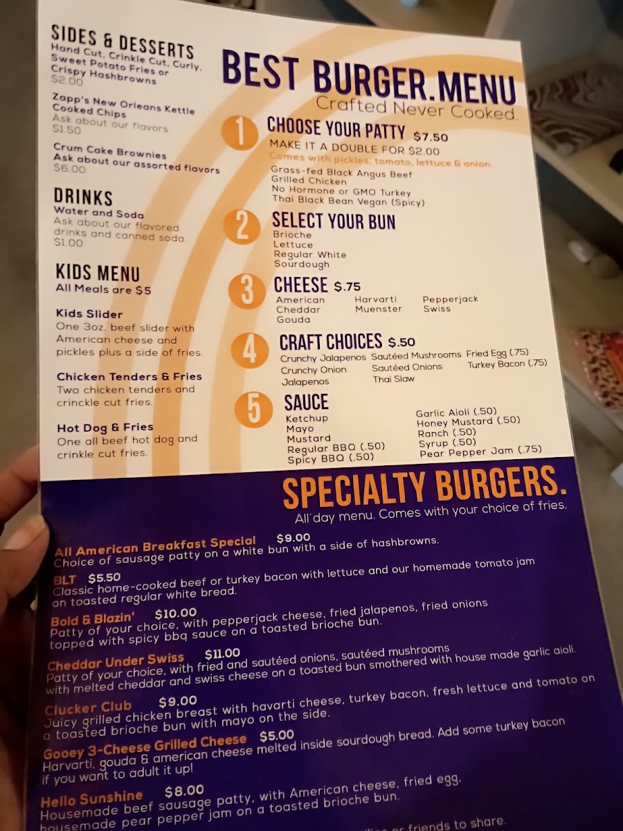 Build Your Own Best Burger is the highlight here, featuring options like grass-fed Black Angus beef, non-GMO ground turkey, Thai black bean vegan patties, and grilled chicken—all priced affordably. Each burger comes with fresh toppings like lettuce, pickle, tomato, and onion, allowing for customization.